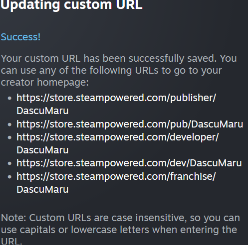 Pirate PR note: this step is important, it’s what makes your curator URL (https://store.steampowered.com/curator/45955777) look like a developer URL (https://store.steampowered.com/developer/DascuMaru) and enables many others too: